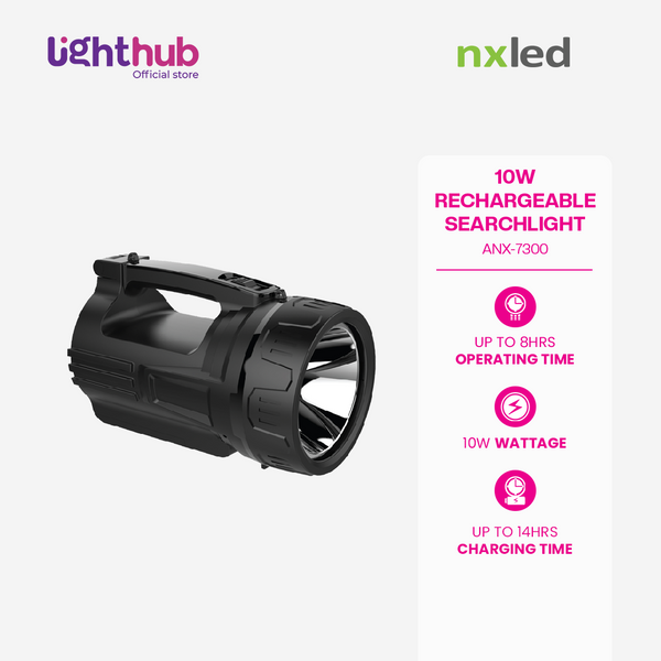 The NxLed Rechargeable Searchlight 10W (ANX-7300) is easy to use. Charge it for 14 hours and enjoy up to 8 hours of powerful illumination. Ideal for emergencies, camping, or home use with its dependable rechargeable design.