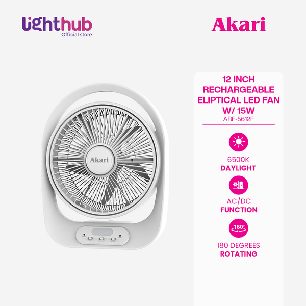 The Akari 12" Rechargeable Elliptical LED Fan with 15W LED combines efficient cooling and bright lighting, perfect for home, emergency, or outdoor use. It features a long-lasting sealed lead-acid battery, dual-speed fan, and extended LED runtime with AC charging support.